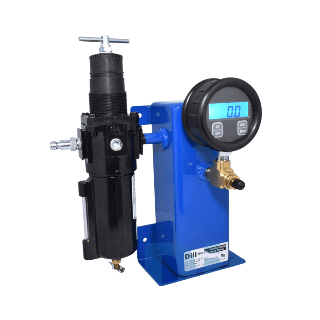 An air gauge check station with a digital display—combining the trusted accuracy of the 8500 model with improved visibility. It features large-bore compatibility and a max operating pressure of 160 psi for quick, reliable compliance checks.