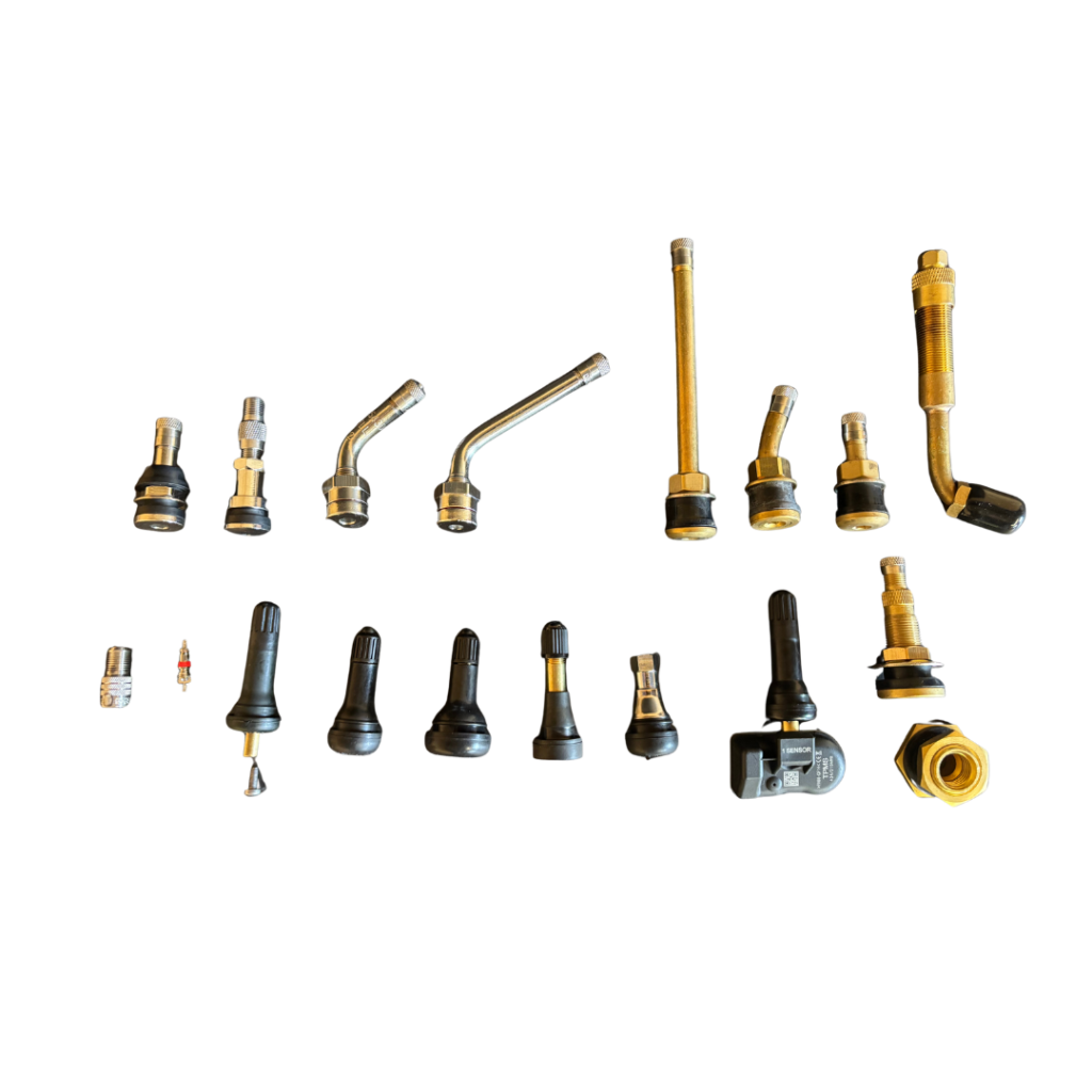 A varied selection of tire valves including clamp-in, snap-in, high-pressure, metal, and specialty types. Designed for use on passenger, light truck, commercial, agricultural, and industrial vehicles. Compatible with standard and TPMS-equipped wheels for reliable air retention and inflation.All All Riel-supplied valves are North American TUV certified.
